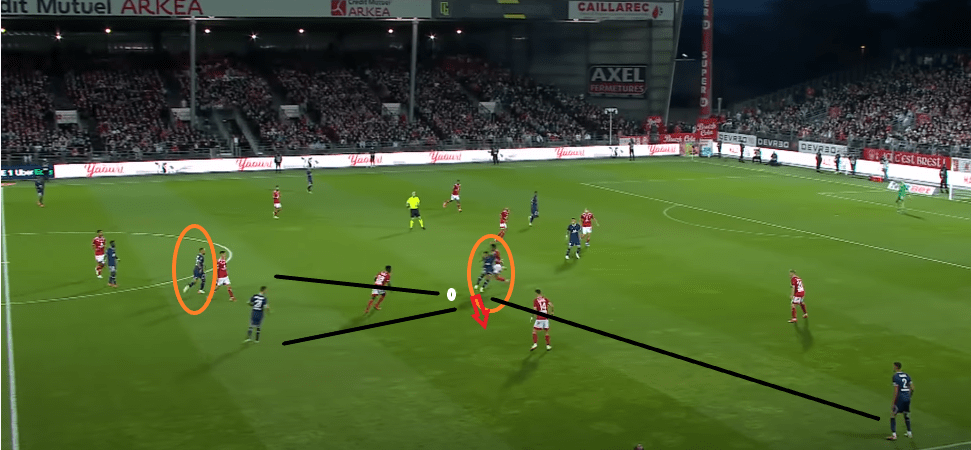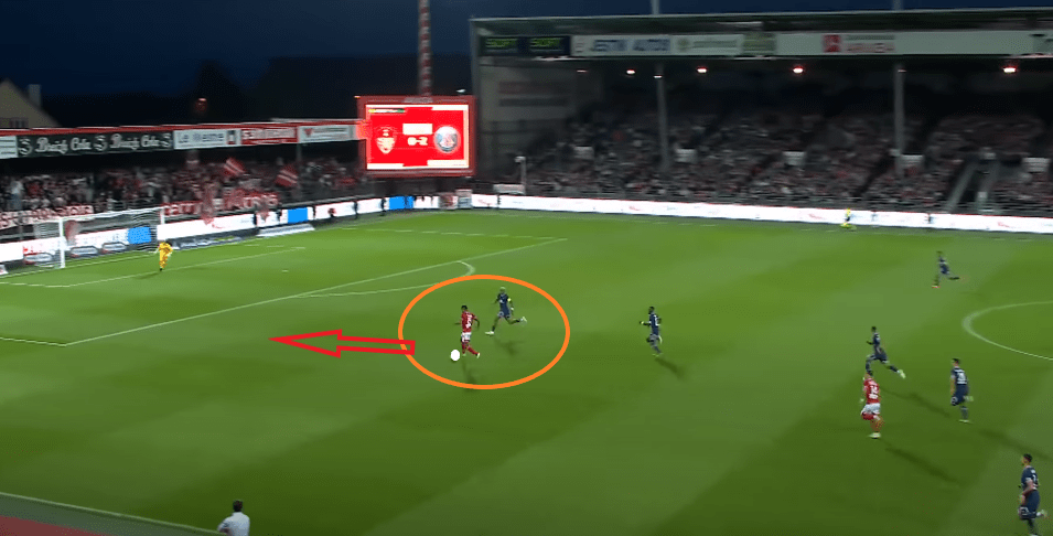 Diallo est très clairement en retard, puisqu’il n’avait pas commencé à se diriger vers son joueur. Et finalement, quand il le fait, il devrait peut-être plutôt attendre un peu pour ne pas laisser un espace, surtout quand on voit la position du Brestois, qui semble parti pour faire la passe. Sauf que Diallo ne peut pas non plus le laisser contrôle.