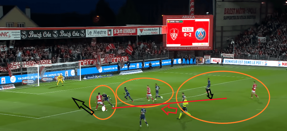 Là, quand on voit les 3 joueurs du PSG sans adversaire, on se dit qu’il était possible de mieux couvrir. Il était possible pour Kehrer et ou Gueye de couvrir le dos de Diallo, alors que Herrera pouvait fermer l’axe. Gueye aussi, en fonction du déplacement de Kehrer. Sauf que tous sont allés vers le ballon et l’attaquant brestois a été seul à droite.