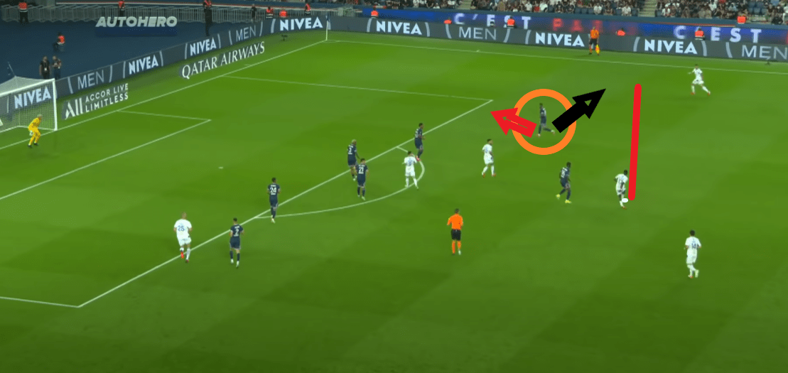 Au moment où Mbappé sort de son dribble et lève la tête, Icardi fait un appel court vers l’arrière pour tenter de surprendre son défenseur, même s’il sera relativement bien suivi (la passe était envisageable, mais compliquée). Surtout, dans son dos, Sarabia s’adapte. Alors qu’il a commencé aussi par un appel en retrait, il change rapidement pour profiter du mouvement de son coéquipier. Il revient donc vers le but, tout en gardant son temps d’avance sur le défenseur acquis lors de sa course dans le dos. On note aussi qu’il aurait été possible de faire une passe en retrait, si jamais la situation n’avait pas été débloquée devant le but.