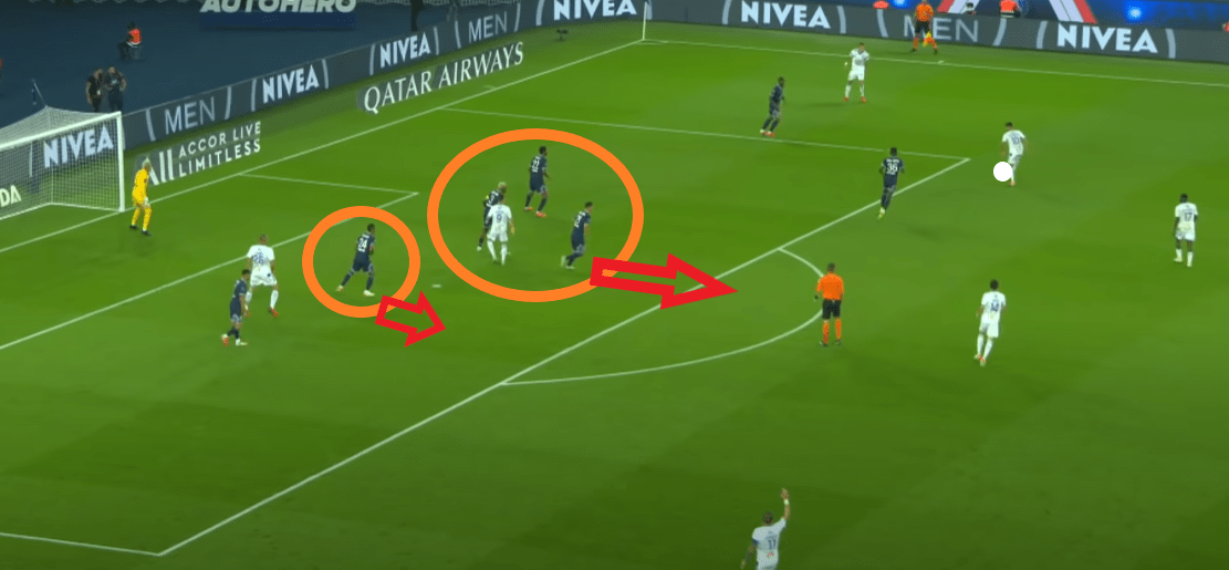 Hakimi est un peu monté pour cadrer le porteur du ballon et Kehrer s’est décalé pour le couvrir, alors qu’il y a un appel qui vient du milieu de terrain. On note que Draxler est toujours loin, alors que ce serait à lui aider. Au centre, Kimpembe accélère pour venir au contact d’Ajorque, alors son adversaire précédent s’est arrêté.