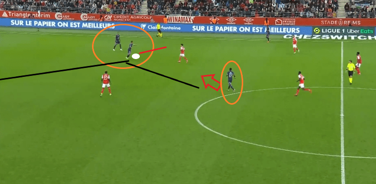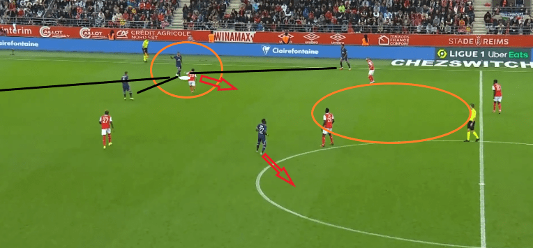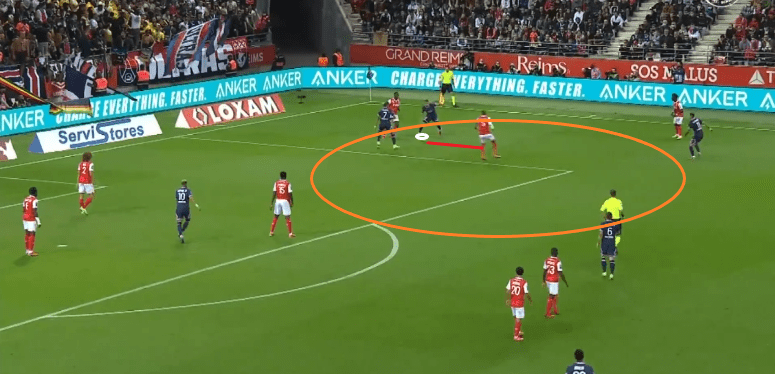 On remarque que le Rémois qui va recevoir le ballon n’aura presque que des Parisiens dans son champ de vision. A part les défenseurs dans la surface, mais il faut oser se tourner vers son but et Neymar est prêt à aller couper la passe si nécessaire (il pourrait être déjà devant, mais c’est encore le début de la saison et il se tient tout de même prêt). On peut regretter l’espace entre Mbappé et Hakimi qui permet la passe, mais il va être très bien rattrapé par un sprint de Hakimi.