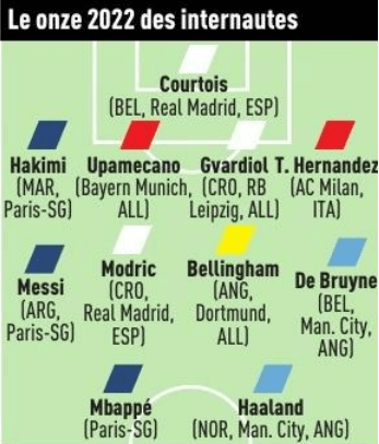 On note enfin que l’on ne trouve pas les régulièrement très bons Marco Verratti (milieu de 30 ans) et Neymar (attaquant de 30 ans). Cela s’est joué sur quelques votes pour le second face à de Bruyne (autant de voix récoltées, mais le Belge a été 9 fois le premier choix des internautes alors que cela n’a pas été le cas pour le Brésilien).