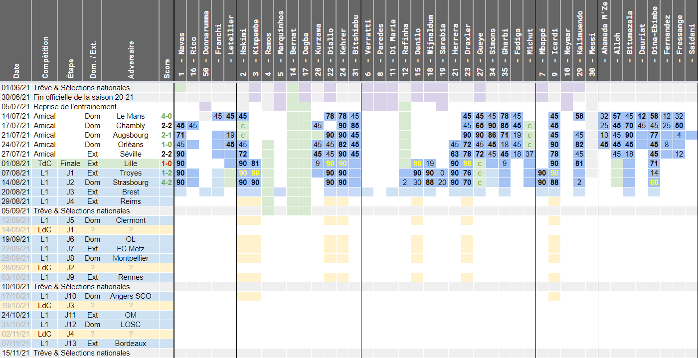Légende: couleur de fond : bleu : dans le groupe ; vert : blessé (C si Covid-19) ; jaune/rouge : a pris 1/2 carton en 10 matchs ; Couleur de police : gras : titulaire ; vert : blessure ; jaune/rouge : carton.