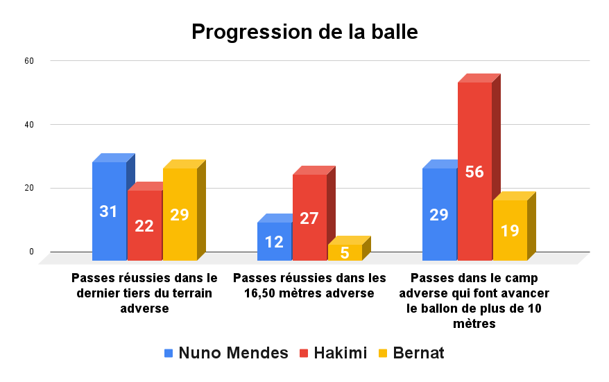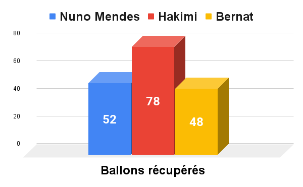 Rapporté au nombre de matchs, Hakimi est celui qui touche le plus de ballons en moyenne. Il est aussi celui qui est le plus souvent sur le terrain donc cela peut expliquer les choses. Cependant, Bernat qui a moins joué, a un ratio supérieur à Nuno Mendes. Il faut dire que le lien entre Neymar et Mbappé avec Bernat est bien rôdé et l’Espagnol est très propre techniquement.