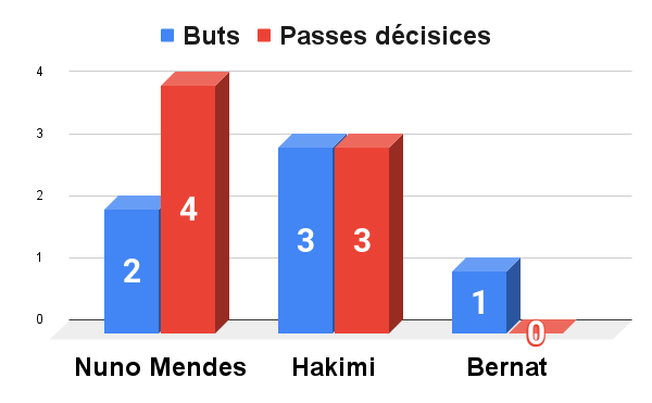 Quand on dit latéraux au PSG, on cherche aussi de l’efficacité offensive pour aider l’équipe. Le bilan entre Hakimi est Nuno Mendes est assez équilibré. Bernat a été moins décisif, de manière assez claire.