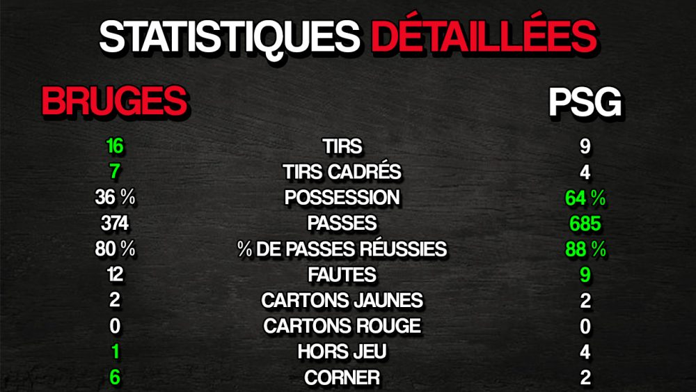 Le match s’est un peu équilibré, Bruges accusant par moments la fatigue a terminé à l’énergie. Mais malgré cela, les Belges ont plus tiré, 7 contre 5. Ils ont aussi plus vu le ballon et le PSG s’est concentré pour jouer plus resserré et avec un peu plus d’envie. Seulement Navas fait encore 2 arrêts, contre 1 pour Bruges, donc malgré les intentions de faire mieux qu’en première mi-temps, les Parisiens ont une nouvelle fois été en difficulté dans la créativité générale.