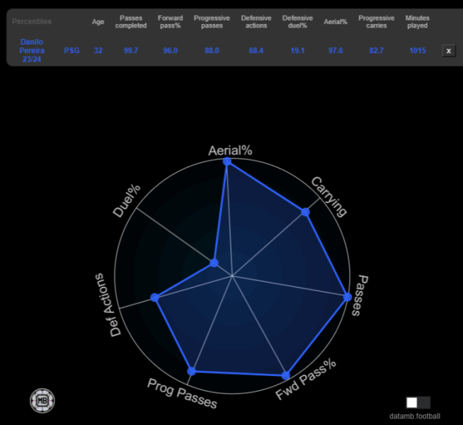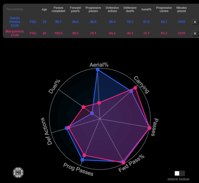 On le voit, les deux joueurs sont assez proches, Danilo est en revanche bien meilleure dans les duels aériens, un gros point positif pour lui, alors que Marquinhos n’est que rarement au-dessus du Portugais, ce qui se confirme dans le ressenti en match.
