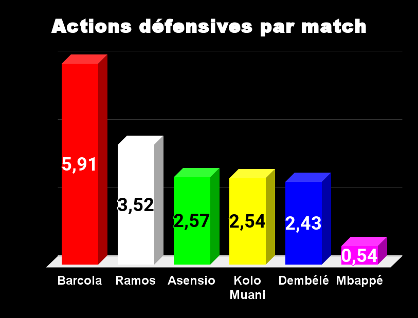 Pas de surprise ici, c’est l’état d’esprit qui est récompensé. Barcola est un formidable joueur offensivement, mais il sait défendre et le fait même très bien. Ramos montre aussi son utilité, alors que le reste des joueurs se tiennent de près, sauf Mbappé qui marque les esprits par l’écart entre lui et les autres. Il fait moins d’une action défensive par match…