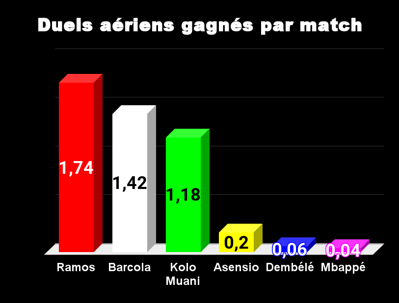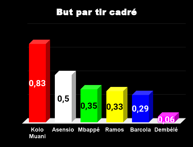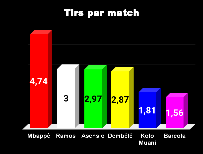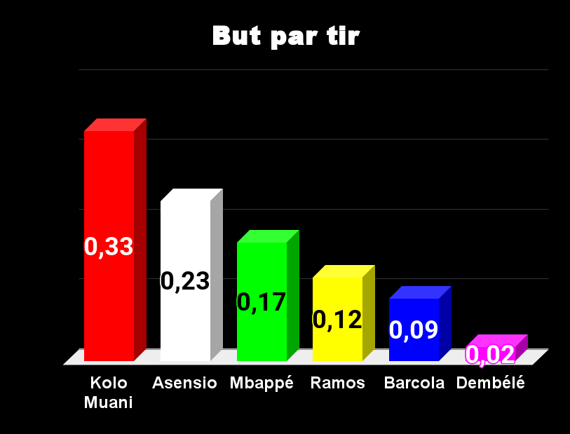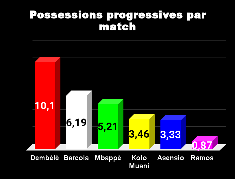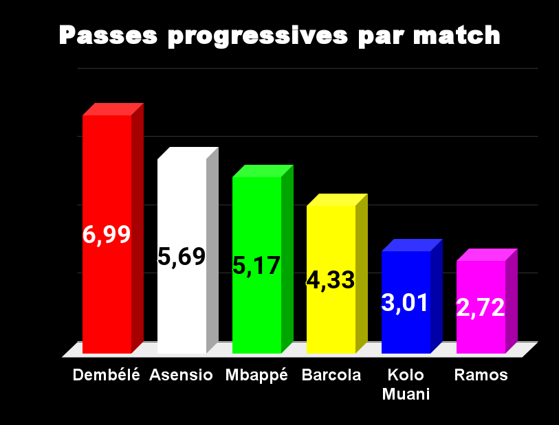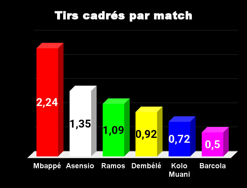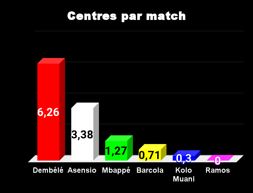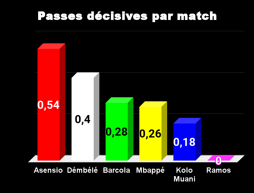 Tous les ballons passent par Mbappé, il n’est pas étonnant de le voir en tête. La seconde place revient à Ramos, pourtant, Luis Enrique ne le fait pas jouer. Asensio et Dembélé tirent également beaucoup, on le sait, avec efficacité pour le premier et avec peu de réussite pour le second. Dans ce domaine Barcola est largement en retrait.