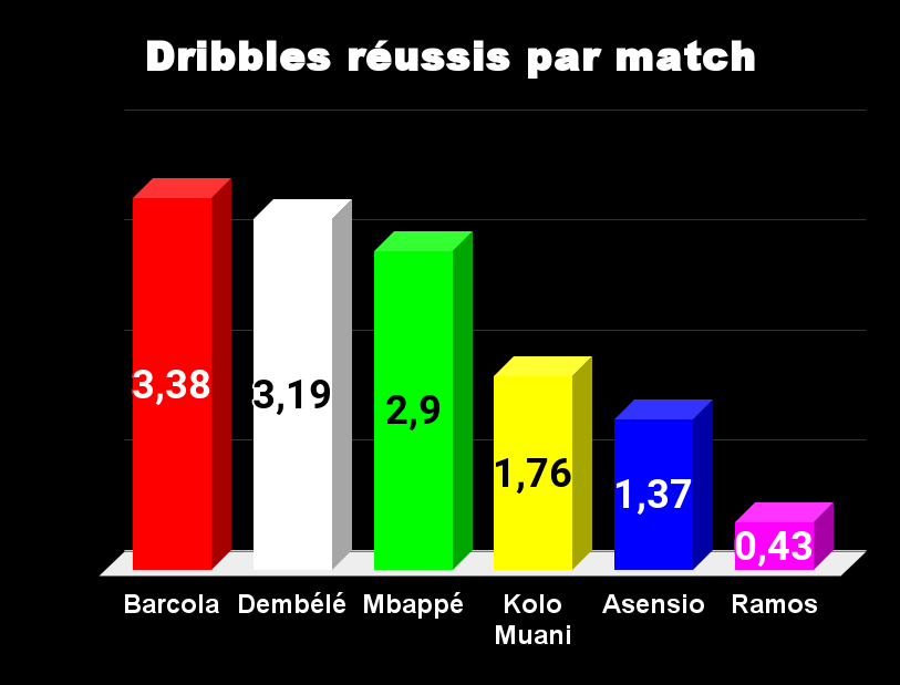 Tout le monde n’est pas Barcola, Dembélé ou Mbappé. Les trois sont intéressants et Kolo Muani n’est finalement pas tant en retrait qu’on pouvait le penser. Asensio joue plus direct et compte moins sur ses dribbles, mais il est en retrait dans ce domaine. Ramos paye aussi un début de saison en grande manque de temps de jeu, même si on sait que de toute façon, le dribble est moins dans ses qualités.