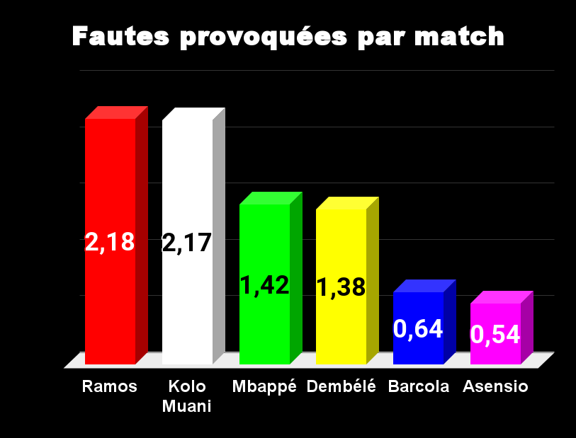 Provoquer des fautes, c’est récupérer des coups francs. Ce PSG n’en profite pas souvent. Cependant, il est important de noter que ce sont les deux joueurs les plus en difficulté qui sont en tête, également parmi les meilleurs dans le jeu aériens et également dans le jeu dos au but afin de garder la balle. Luis Enrique utilise peu ce « plan tactique ».