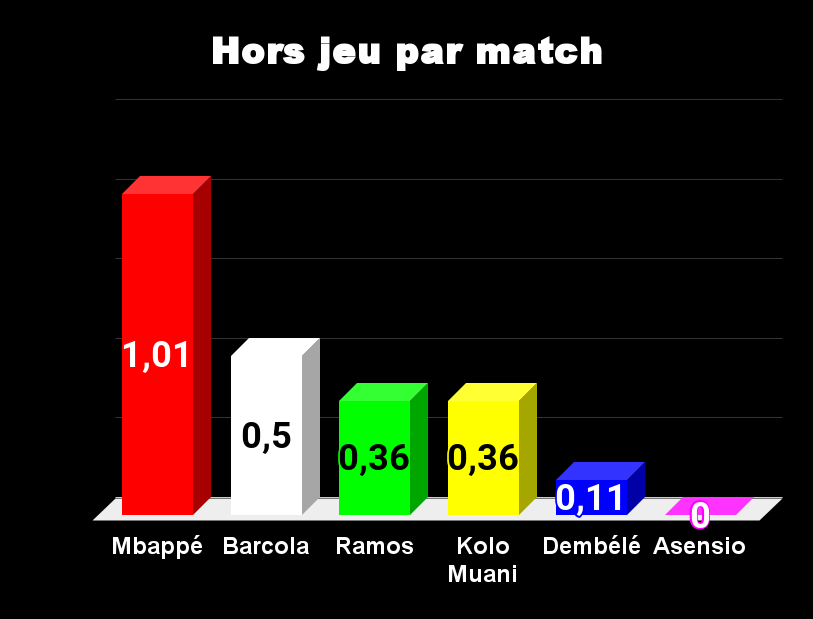 Soit il va trop vite, soit il ne se replace pas. C’est l’un des défauts de Mbappé, il peut être souvent hors-jeu. Barcola va vite et forcément, le retrouve à la seconde place n’a rien d’étonnant. Dembélé et Asensio font peu d’appels ce qui explique qu’ils ne sont quasiment jamais hors-jeu.
