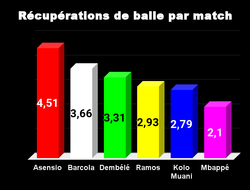 Quand on dit qu’Asensio peut jouer au milieu, on n’est pas loin de la vérité. C’est un joueur qui se donne beaucoup dans l’activité. Il a presque 3 ballons récupérés par match en plus que Mbappé, dernier dans ce domaine, qui, on le sait ne se bat pas énormément défensivement. Pour le reste, le PSG possède une ligne d’attaque assez courageuse défensivement.