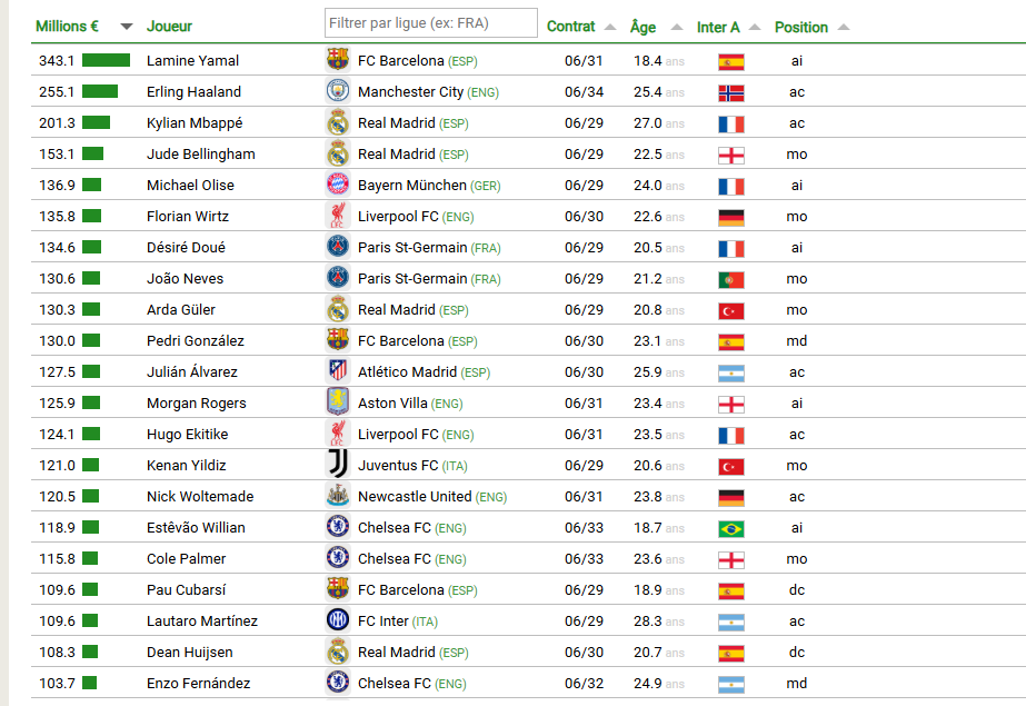On peut tout de même retenir que le PSG est, assez logiquement, bien représenté. C’est un effectif de très haut niveau, avec certains joueurs qui ont bien progressé ces derniers mois. Doué, Neves, Barcola, Pacho, Nuno Mendes ou Kvaratskhelia sont ainsi estimés à un prix plus élevé que celui de leurs achats. Un signe intéressant pour le travail lors du recrutement et celui au quotidien.