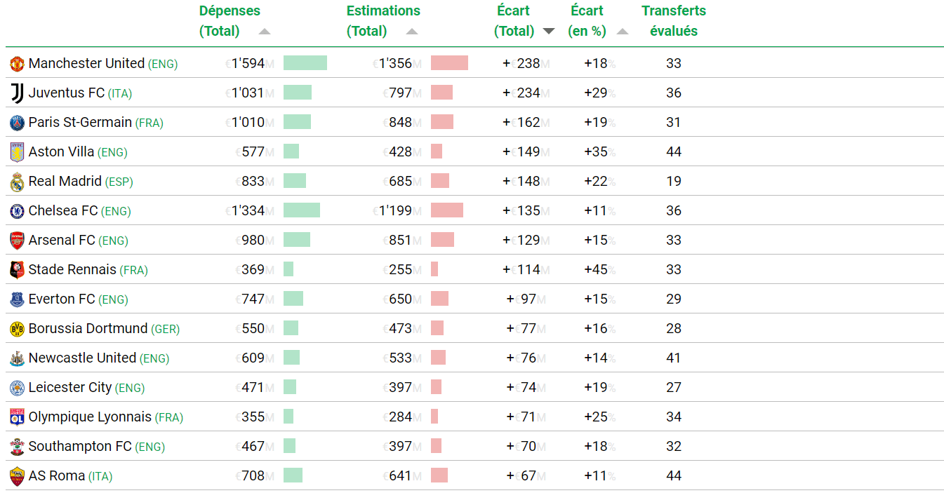 Enfin, n’oublions pas ici qu’il ne s’agit que d’une estimation des prix des joueurs. Ce qui peut toujours être discuté. Notamment parce que l’estimation se fait aussi entre les deux clubs, alors peut-être que l’écart indiqué ici pour tous les clubs est de toute façon un peu exagérée. On peut enfin noter que Manchester United et la Juventus sont devant au classement, pourtant ce sont des projets qui loin d’être en train d’avancer de façon évidente.