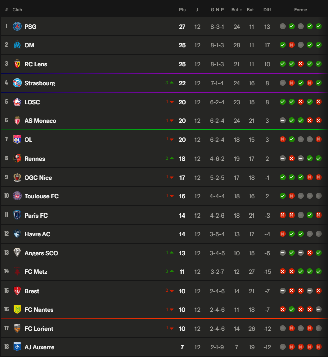 L’autre gros coup du haut de tableau vient de Strasbourg avec un succès précieux contre Lille dans un match très serré (5 tirs à 6, 49% de possession) grâce au doublé d’Emmanuel Emegha. De quoi dépasser l’adversaire du jour, logiquement frustré. On peut aussi noter que la remontée continue pour Rennes, via une victoire face au Paris FC. C’était en souffrant, mais les points sont là et Habib Beye défend encore une place très menacée il y a peu.