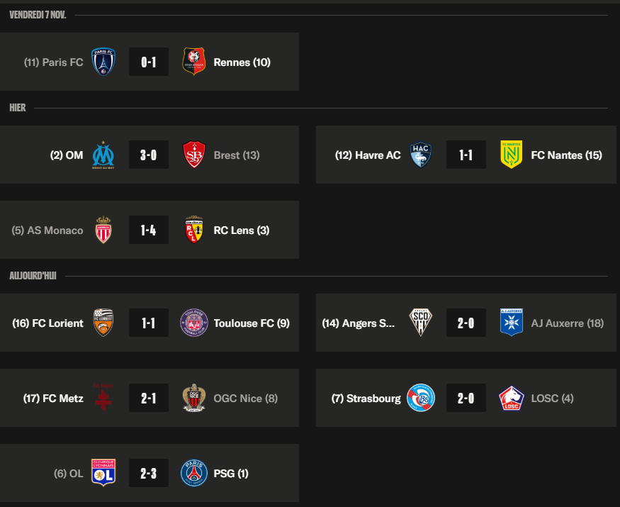 En clôture de cette journée, le PSG a dû se battre jusqu’au bout afin de s’imposer. Pourtant, il a souvent eu la maîtrise et n’a pas concédé beaucoup de grosses occasions. Sauf que Lyon a su être très efficace, face à Lucas Chevalier peu inspiré. Les Parisiens ont le mérite de ne jamais paniquer et de savoir pousser jusqu’au bout. Il le fallait afin de rester premier pour la trêve internationale.