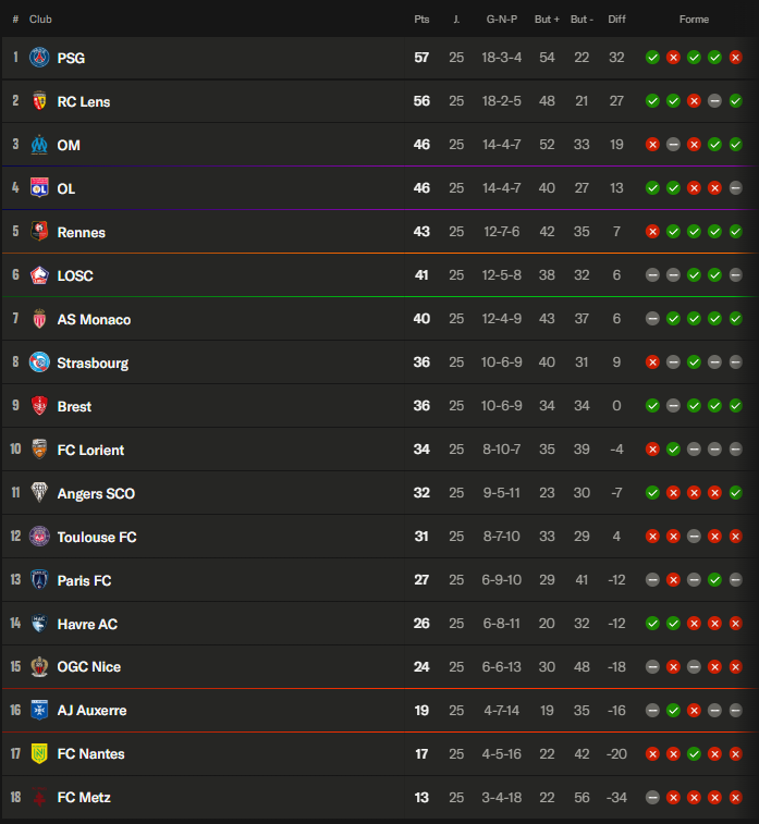 Ligue 1 – Ce qu’on retient de la 25e journée : Lens rattrape Paris, l’OM 3e