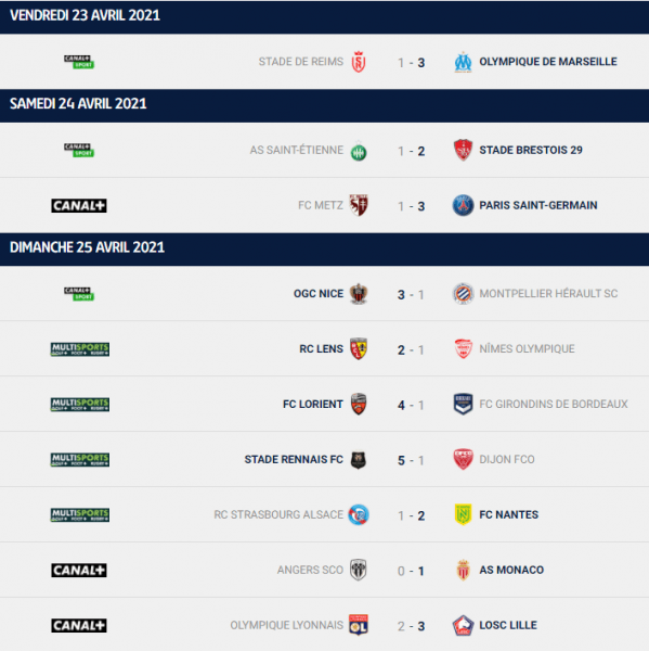 Lors de la 34e journée de Ligue 1, le Paris Saint-Germain s’est imposé à Metz 1-3 restant ainsi à 1 point du LOSC, toujours leader après sa victoire 2-3 contre l’Olympique Lyonnais. L’AS Monaco suit le rythme des 2 premiers avec une victoire 0-1 contre Angers.