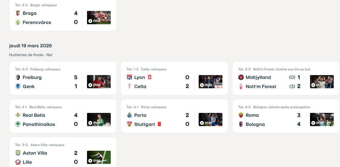 Ce jeudi se jouaient les 8es de finale retours de la Ligue Europa 2025-2026, avec Lille et l’Olympique Lyonnais comme clubs français concernés (l’OGC Nice a été éliminé dans la phase de ligue). Voici les résultats ce jeudi et les qualifiés, sans clubs français.