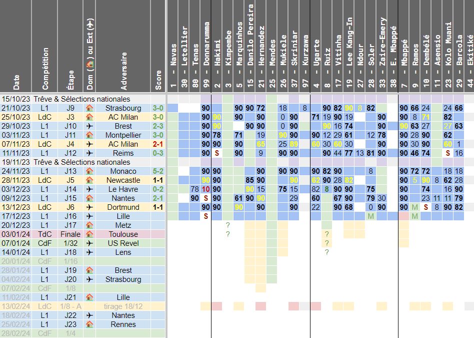 Tableau des disponibilités des joueurs du PSG