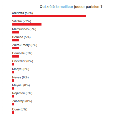 Un succès plutôt logique, puisque le Portugais a été un peu « l’étincelle » afin de créer des occasions dans un PSG sinon très terne. Il n’a pas été parfait, mais on retient qu’il a amené du rythme et du danger, sans oublier de défendre. N’oublions pas que Nuno Mendes a inscrit le but parisien, ce qui compte forcément.