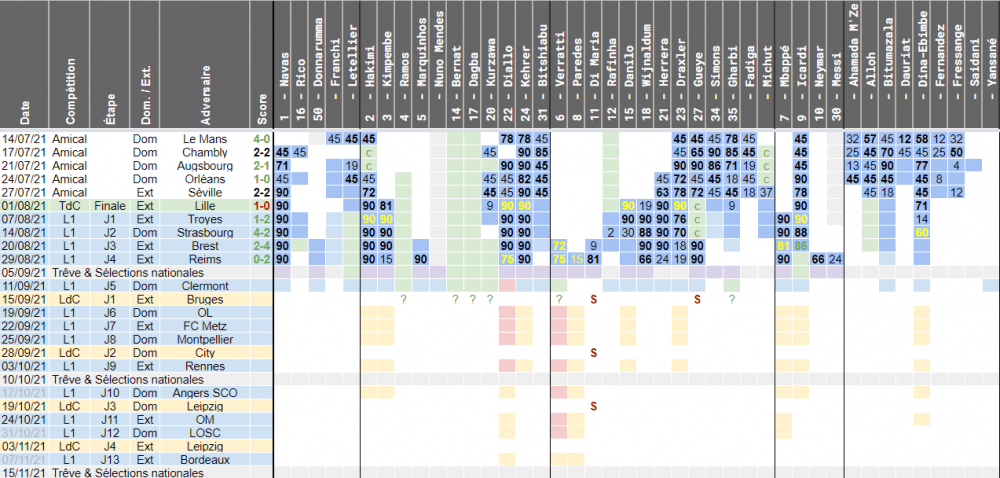 Légende: couleur de fond : bleu : dans le groupe ; vert : blessé (C si Covid-19) ; jaune/rouge : a pris 1/2 carton en 10 matchs ; Couleur de police : gras : titulaire ; vert : blessure ; jaune/rouge : carton.