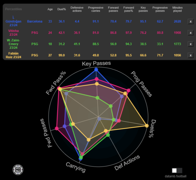 Gundogan n’est pas si éloigné de ce que fait Vitinha cette saison, c’est une sacrée performance pour le portugais. On note que Zaïre-Emery est encore un peu en dessous ainsi que Fabian Ruiz. L’Espagnol est clairement plus présent dans les duels, mais pêche dans les autres domaines. Gundogan est un joueur de classe mondiale, mais il tend à baisser de régime cette saison. Il faudra évidemment compter sur lui pour le quart de finale, avec son expérience et son talent, il serait malvenu de l’enterrer.