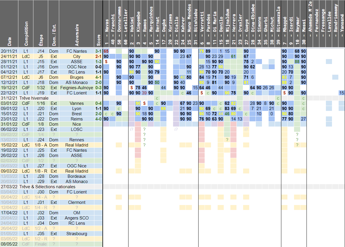 Légende: couleur de fond : bleu : dans le groupe ; vert : blessé (C si Covid-19) ; jaune/rouge : a pris 1/2 carton en 10 matchs ; Couleur de police : gras : titulaire ; vert : blessure ; jaune/rouge : carton.