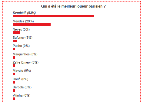 Une victoire sans grande surprise pour Dembélé tant il a brillé lors du Classico. Il y a, bien sûr, le doublé inscrit et une très belle passe décisive pour Khvicha Kvaratskhelia (attaquant de 24 ans), mais aussi toute son activité dans le jeu et le pressing très agressif. Le numéro 10 parisien semble être de retour en pleine forme, on ne peut qu’espérer qu’il continue.