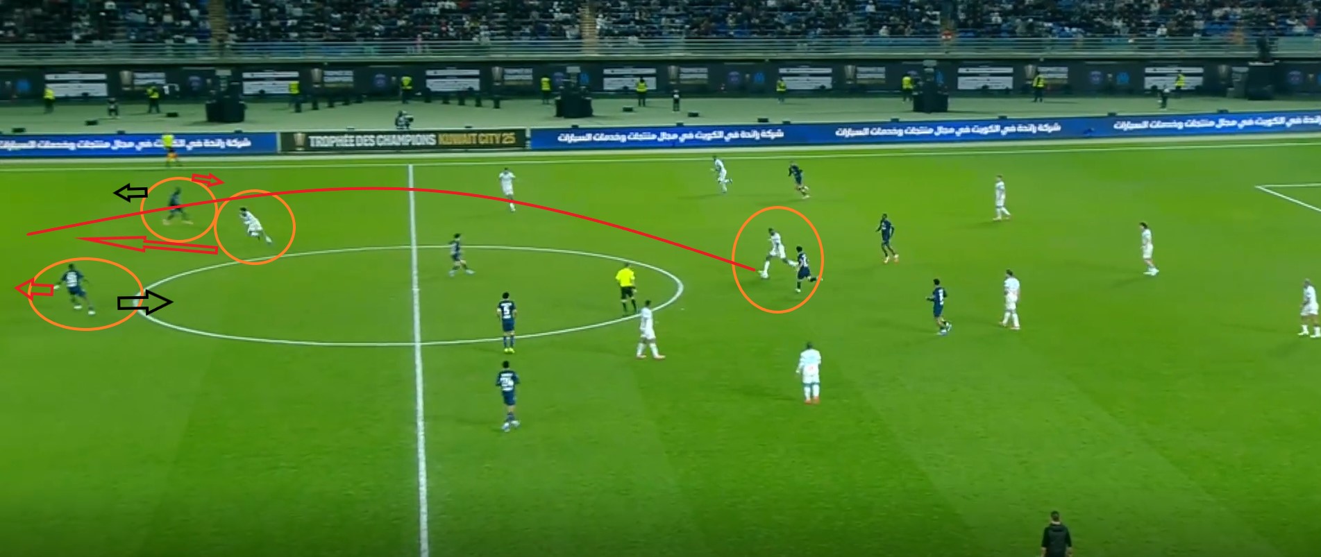 Sauf qu’il a choisi de dribble, possiblement pour une frappe plus simple. C’est compréhensible, mais aussi risqué. Car une balle perdue dans le dribble peut mener à un contre plus rapide. Pacho ne se laisse pas prendre dans la feinte (il faut souligner qu’il défend particulièrement bien, car le tacle pouvait être tentant) et arrive à transmettre à Nuno Mendes. Lequel joue rapidement sur Vitinha.