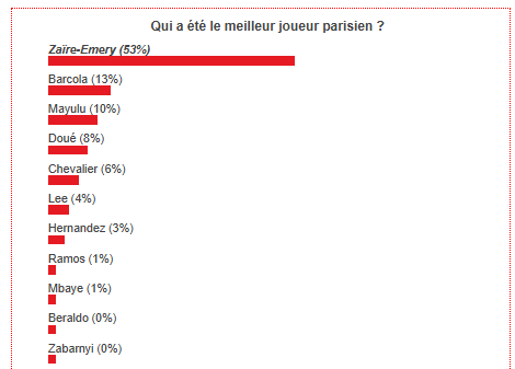 Un succès qui semble assez logique tant le Titi a été précieux au PSG. Fort à la récupération du ballon, il a aussi été plus entreprenant et précis dans le jeu que pendant sa période compliquée. C’est un plaisir de revoir Zaïre-Emery à ce niveau, on espère qu’il pourra enchaîner et monter encore en puissance.