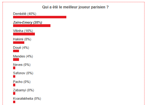 C’est une petite surprise, puisqu’il y a beaucoup de frustration face à l’inefficacité du PSG. Cependant, Dembélé n’a pas été le plus frustrant et il est le seul à avoir su marquer. Cela compte forcément. Warren Zaïre-Emery (milieu de 19 ans) a encore été intéressant alors que Vitinha (milieu de 26 ans) a dirigé un jeu clairement dominé par le jeu. Cela semble plutôt logique qu’ils complètent le podium au bout de ce match très frustrant.