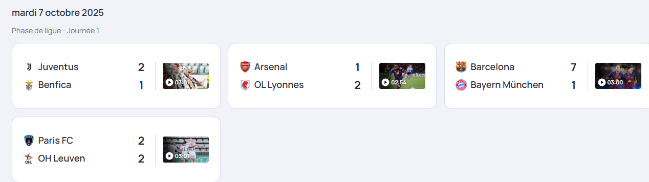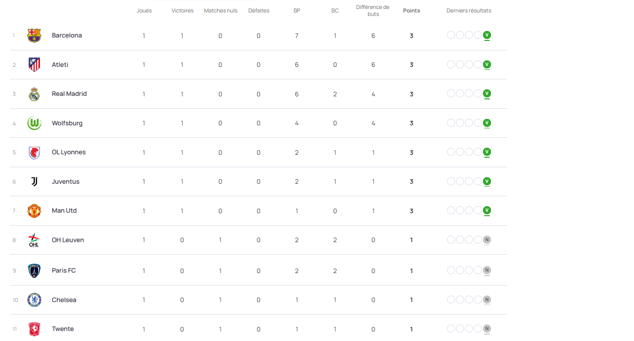 Cette semaine a été jouée la 1ere journée de la Ligue des Champions Féminine 2025-2026, avec notamment le Paris Saint-Germain qui s’est incliné 4-0 face à Wolfsbourg au AOK Stadion ce jeudi soir. Voici tous les résultats des matchs de cette semaine européenne, ainsi que le classement de la phase de ligue (en 6 journées).