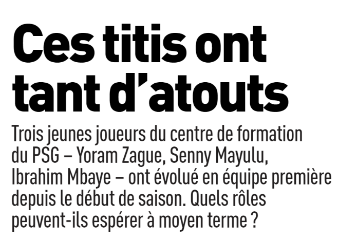Ce mardi 24 septembre, la presse française (sur l’aspect sportif) s’est concentrée du côté du Paris Saint-Germain sur un Olympique de Marseille peut-être capable de le concurrencer, la vie de Sergio Rico depuis son accident et son départ, ainsi que la place de 3 Titis du PSG : Yoram Zague (défenseur de 18 ans), Senny Mayulu (milieu/attaquant de 18 ans) et Ibrahim Mbaye (attaquant de 16 ans).