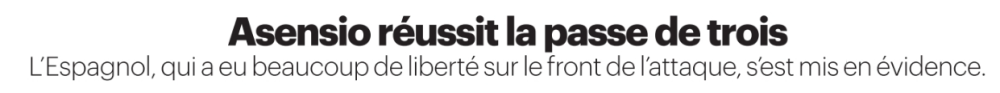 On note qu’Asensio a joué faux 9 et cette fois cela ne pose de problème à personne, ses 3 passes décisives sont même soulignées. C’est intéressant comme l’efficacité change les avis tactiques.