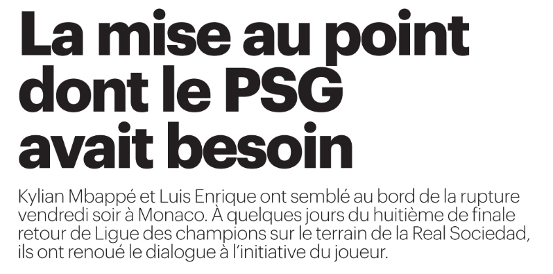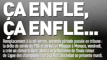 Ce dimanche 3 mars, la presse française (sur l’aspect sportif) s’est concentrée du côté du Paris Saint-Germain sur la relation entre le coach Luis Enrique et l’attaquant Kylian Mbappé (25 ans), remplacé à la mi-temps vendredi contre Monaco avant de faire un tour d’honneur et d’aller en tribune pour la seconde période. Le journal francilien évoque surtout l’apaisement que l’on a déjà pu voir, alors que le média sportif vise plutôt le drame (surprenant…) et souligne que l’entraîneur et le club ont déjà vécu ces grandes tensions avec des stars. Il y a aussi un mot sur le groupe, avec les retours espérés de Danilo Pereira et Marquinhos (défenseurs de 32 et 29 ans) pour le 8e de finale retour de la Ligue des Champions.