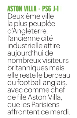 Aston Villa a une histoire particulière, c’est aussi un certain lieu de football. C’est donc à voyage à prendre au sérieux et qui change des habitudes. Normalement, il n’y a pas de quoi perturber les Parisiens. Mais c’est toujours intéressant de découvrir et il faudra avoir le plus grand respect malgré le succès de l’aller afin d’éviter une immense déconvenue.