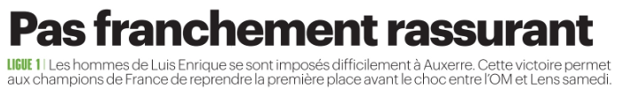 Ce samedi 24 janvier, la presse française (sur l’aspect sportif) s’est concentrée du côté du Paris Saint-Germain sur la victoire hier soir contre Auxerre en ouverture de la 19e journée de Ligue 1 2025-2026 (résumé vidéo Auxerre/PSG). Il y a aussi un mot sur le transfert de Dro Fernandez (milieu de 18 ans du FC Barcelone) qui traîne et est remis en question.