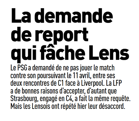 Quant au report de Lens/PSG, c’est un point de tension. Il y a ceux, dont le PSG, qui favorisent la préparation des quarts de finale de la Ligue des Champions contre Liverpool, et ceux qui voient un club qui doit s’adapter à ses ambitions sans bouleverser le championnat. La Ligue de Football Professionnel doit trancher jeudi, mais ce choc pour la course au titre promet déjà de belles tensions. En attendant, le match PSG/Nantes (prévu initialement entre les 8es de finale face à Chelsea) a été fixé au mercredi 22 avril à 19h.