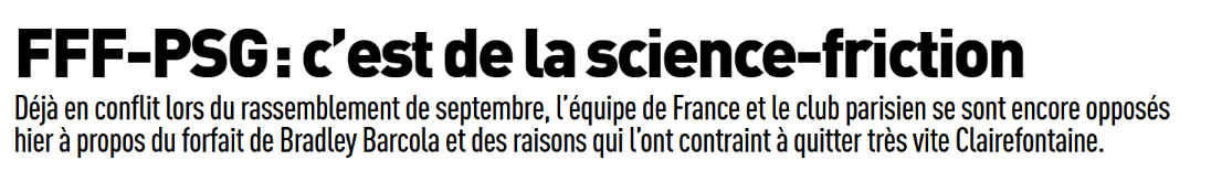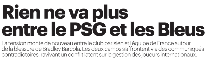 Ce mardi 7 octobre, la presse française (sur l’aspect sportif) s’est concentrée du côté du Paris Saint-Germain sur le conflit lancé ce lundi avec la Fédération Française de Football autour de Bradley Barcola. Cette dernière a annoncé le forfait de l’attaquant de 23 ans pour la trêve d’octobre à cause d’une « lésion chronique depuis le 17 septembre » et le PSG a démenti sèchement. Il y a aussi Senny Mayulu (milieu de 19 ans) qui est forfait avec les espoirs (sans oublier João Neves avec le Portugal) et un mot sur le retour en forme de Lucas Hernandez (défenseur de 29 ans).
