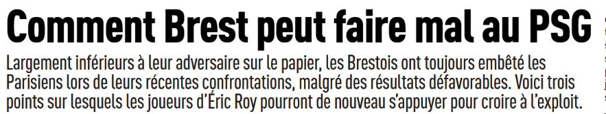 Aux Parisiens d’être au niveau dans l’intensité afin que leurs qualités puissent faire la différence. On a le sentiment que ce groupe est prêt à éviter ce de genre de piège et surtout déterminé à réussir une grande saison. Il va falloir le confirmer. Bien sûr, les Brestois ont des armes et c’est intéressant de voir le journal sportif se concentrer dessus. On peut penser que Paris s’est préparé pour cela.