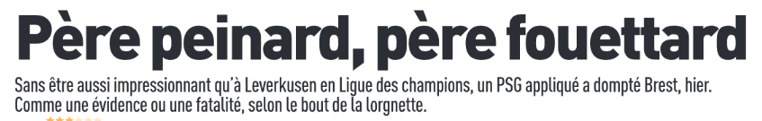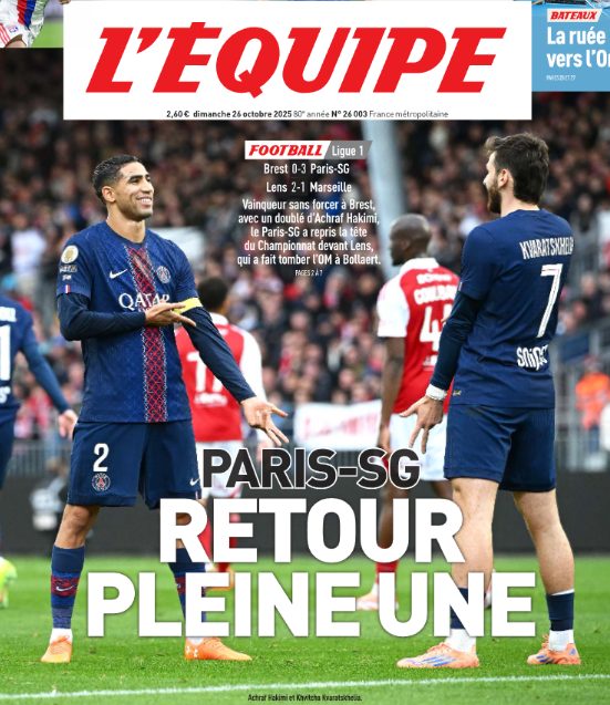 Ce dimanche 26 octobre, la presse française (sur l’aspect sportif) s’est concentrée du côté du Paris Saint-Germain sur la victoire 0-3 contre Brest au Stade Francis Le Blé hier dans le cadre de la 9e journée de Ligue 1 2025-2026. Un succès marqué par le doublé d’Achraf Hakimi (latéral droit de 26 ans) et la première place en Ligue 1 récupérée.