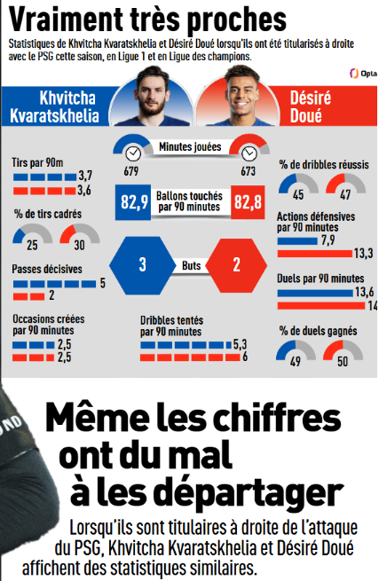 Sur cette rencontre, on peut en effet se demander qui pourrait démarrer entre Kvaratskhelia et Doué. Ils sont les plus à l’aise à droite, tout en étant souvent moins brillant qu’à gauche. Ce qui pourrait aussi mener à d’autres configurations. Bradley Barcola peut être sur le banc, ou en pointe avec Ousmane Dembélé à droite, alors que Doué peut aussi jouer au milieu. Le suspense est grand.