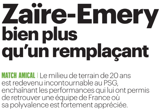 Ce dimanche 29 mars, la presse française (sur l’aspect sportif) s’est concentrée du côté du Paris Saint-Germain sur rien de direct. Il y a surtout le match amical de l’Equipe de France contre la Colombie ce dimanche soir (coup d’envoi à 21h heure française, diffusion sur TF1). Ce devrait être avec une composition très remaniée par rapport à la victoire 2-1 contre le Brésil jeudi soir. Il y a aussi une attention particulière pour Warren Zaïre-Emery (milieu de 20 ans) et Lucas Hernandez (défenseur de 30 ans), qui devraient justement démarrer ce soir.
