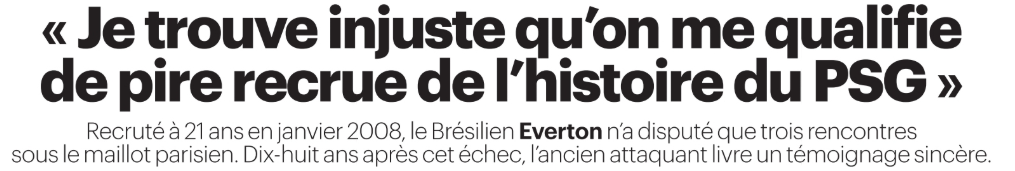 Ce vendredi 6 février, la presse française (sur l’aspect sportif) s’est concentrée du côté du Paris Saint-Germain sur les propos d’Everton, attaquant recruté en 2008 depuis les Corinthians et qui n’a fait que 3 matchs au PSG avant de repartir durant de nombreux prêts (5) puis définitivement en 2011.