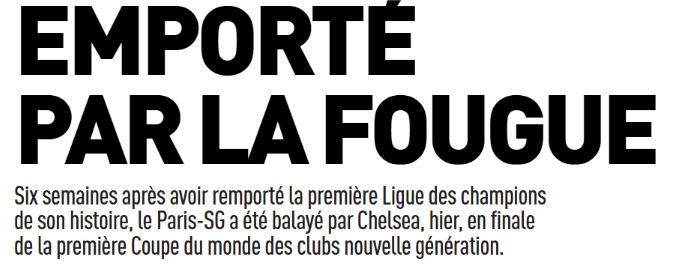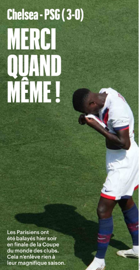 Ce lundi 14 juillet, la presse française (sur l’aspect sportif) s’est concentrée du côté du Paris Saint-Germain sur la lourde défaite du PSG en finale de la Coupe du Monde des Clubs 2025 hier soir contre Chelsea SCORE. Une mauvaise note qui surprend, mais est sans appel. Il y a aussi la volonté de départ de Lucas Beraldo (défenseur de 21 ans).