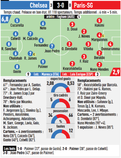 Les Parisiens ont été terriblement dépassés en première période, même s’il y a eu une bonne phase avec deux occasions malheureusement non converties. Puis les approximations ont fini par être payées nettes : 3 grosses occasions pour Chelsea et Cole Palmer a été clinique.