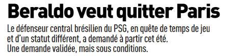 Lequel s’anime déjà, au moins côté rumeurs, puisque L’Equipe annonce déjà l’envie de départ de Beraldo. Laquelle n’est pas impossible à croire et appuierait le besoin du PSG de recruter un défenseur (voire un second). Mais attention, il n’y a encore rien de concret ou de fait.