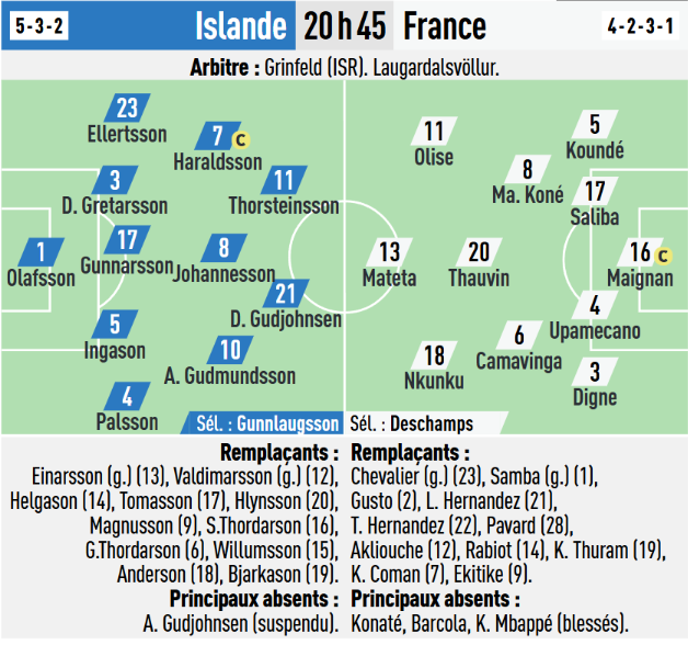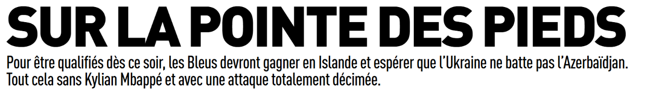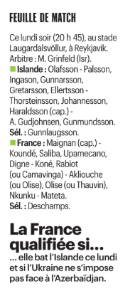 Quant à la France, elle a la possibilité de valider dès ce soir son billet, mais ce sera compliqué. Il faut s’imposer en Islande, rien d’évident. Il est aussi nécessaire que l’Ukraine ne s’impose pas contre l’Azerbaïdjan. Ce qui est arrivé en septembre (1-1), sauf que c’était plutôt une surprise. L’essentiel est de réussir une belle performance ce soir, avec des joueurs qui auront une opportunité de marquer des points puisqu’il y a des absents.